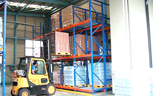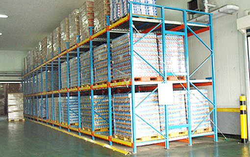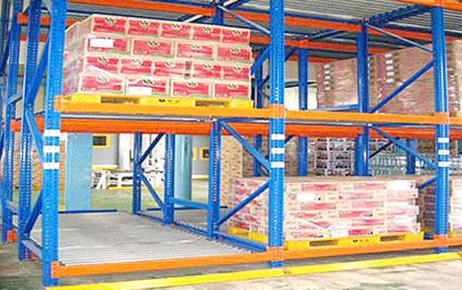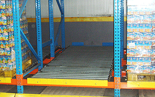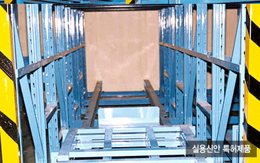 파렛트를 밀어넣으면서 다음의 물건을 격납하는 입출고방식으로 중력을 이용한 파렛트유동선반이다. 동일 상품으로 복수인도되는 상품이나 벽면이용, 출하대기물품의 일시보관등에 그 효과가 높다.